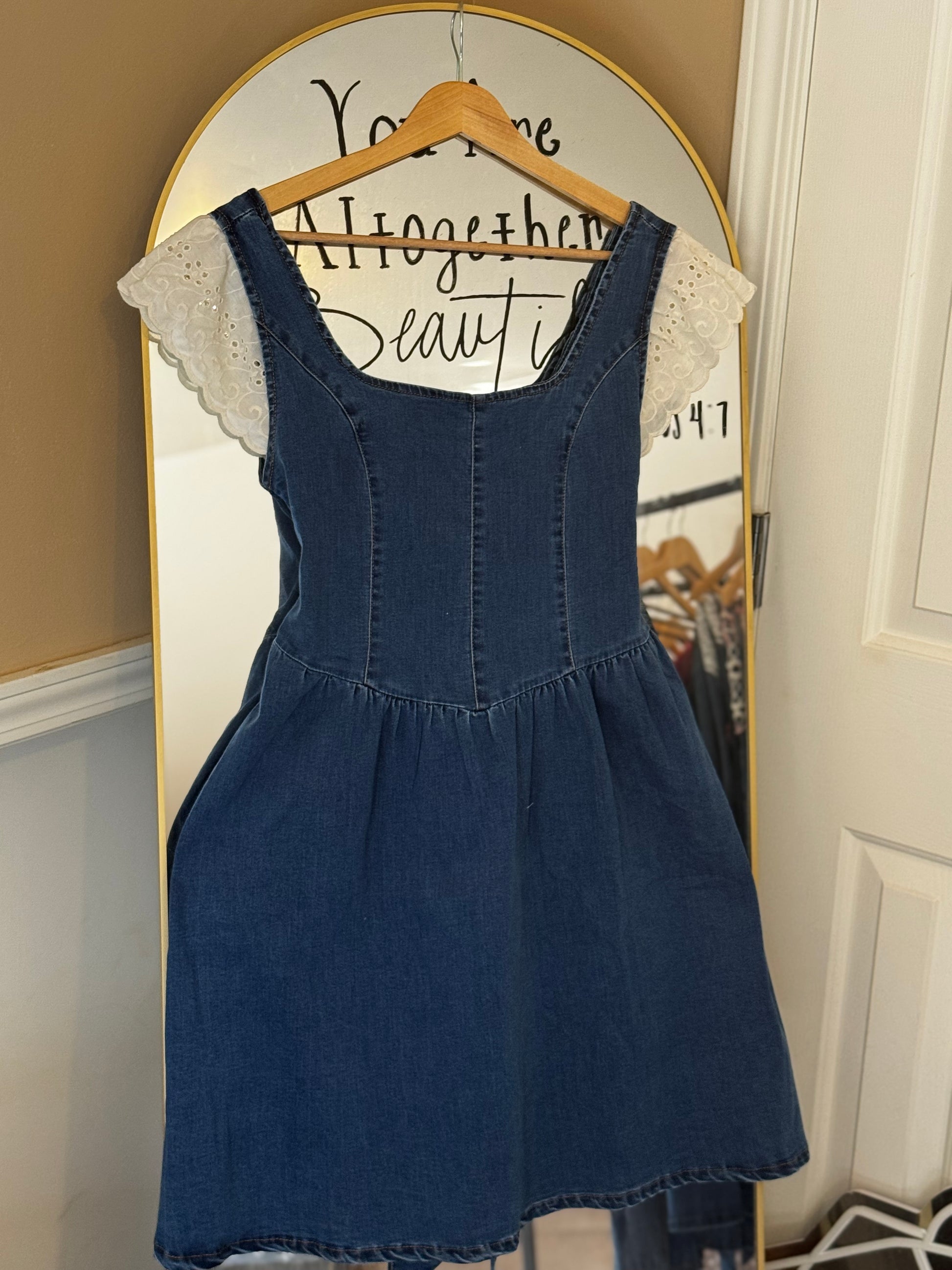 A blue denim A-line dress with a square neckline, unique gathered sleeve details, and a charming bowknot at the back — effortlessly boho.