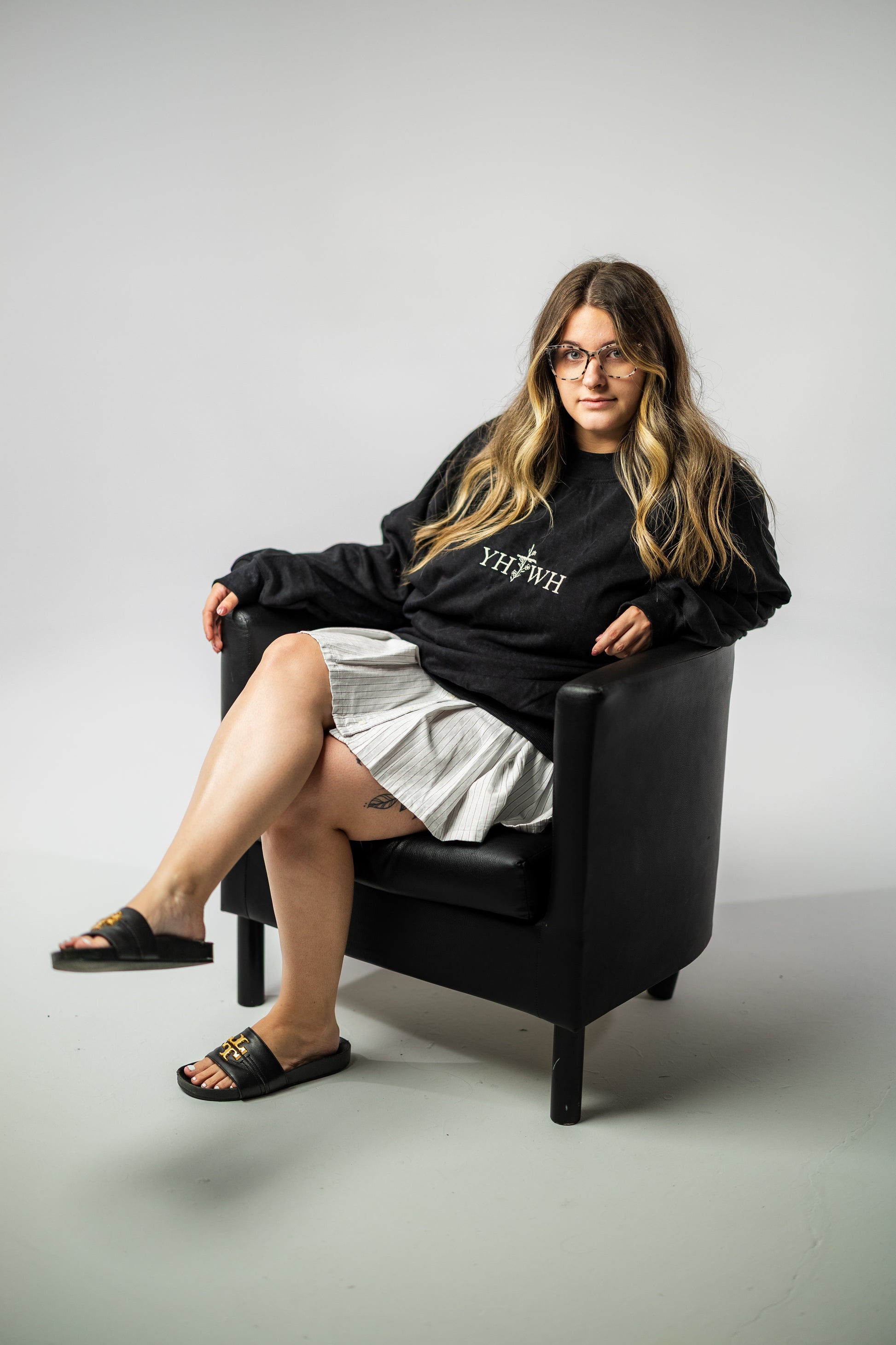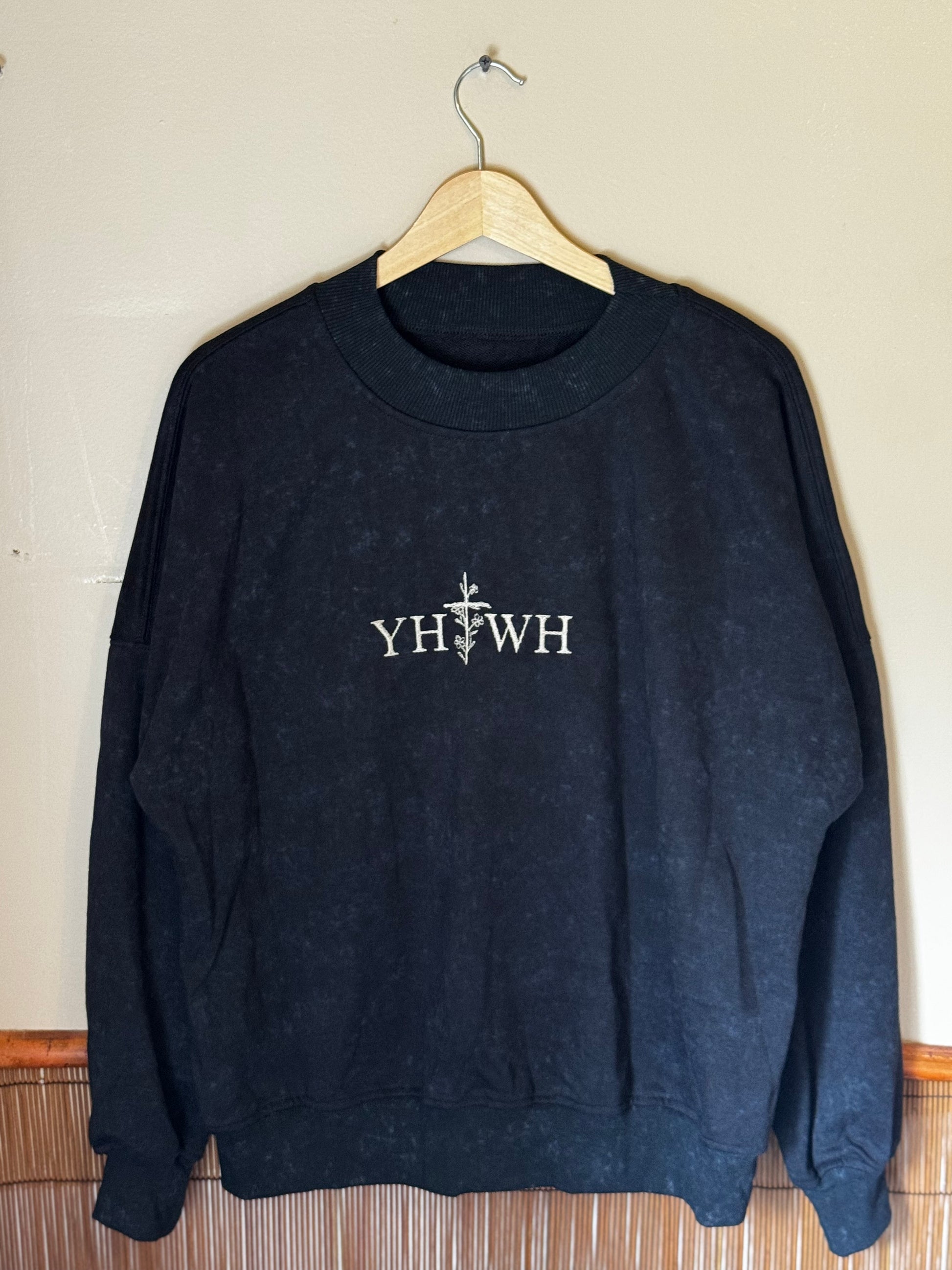 Black acid wash crewneck with cream YAHW and floral embroidery, inspired by Exodus 3:13-14 — a reminder of God’s eternal presence.