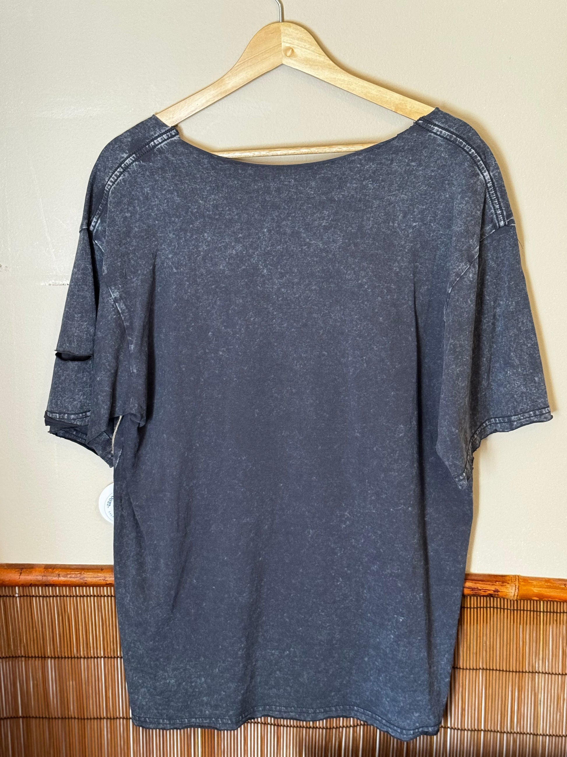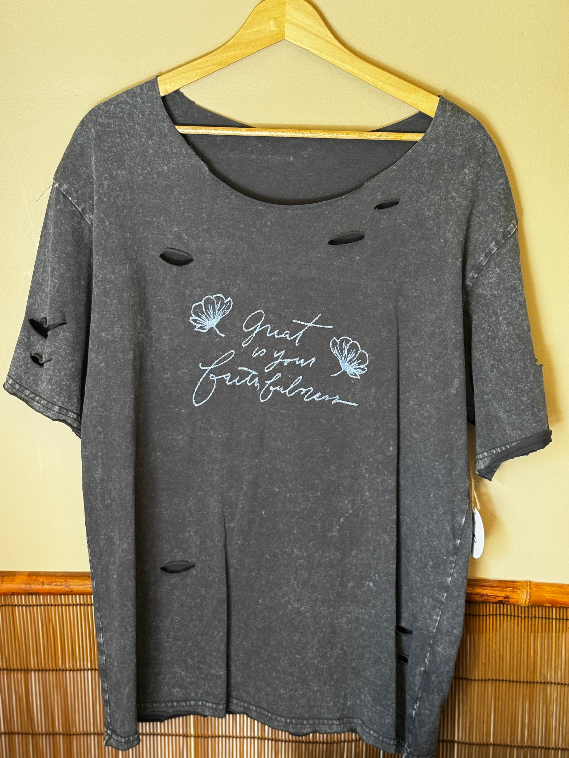 Light grey acid wash distressed t-shirt with blue floral embroidery and “Great is Your Faithfulness” inspired by Lamentations 3:22-24—a cozy reminder of His endless love.