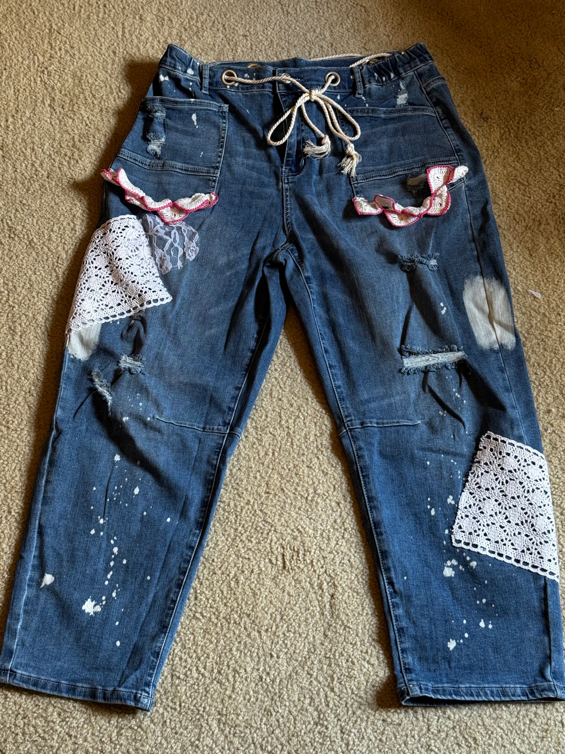 Cropped straight-leg blue jeans with playful paint splatters, doily patchwork, and a rope belt — a one-of-a-kind mix of artsy edge and vintage charm.