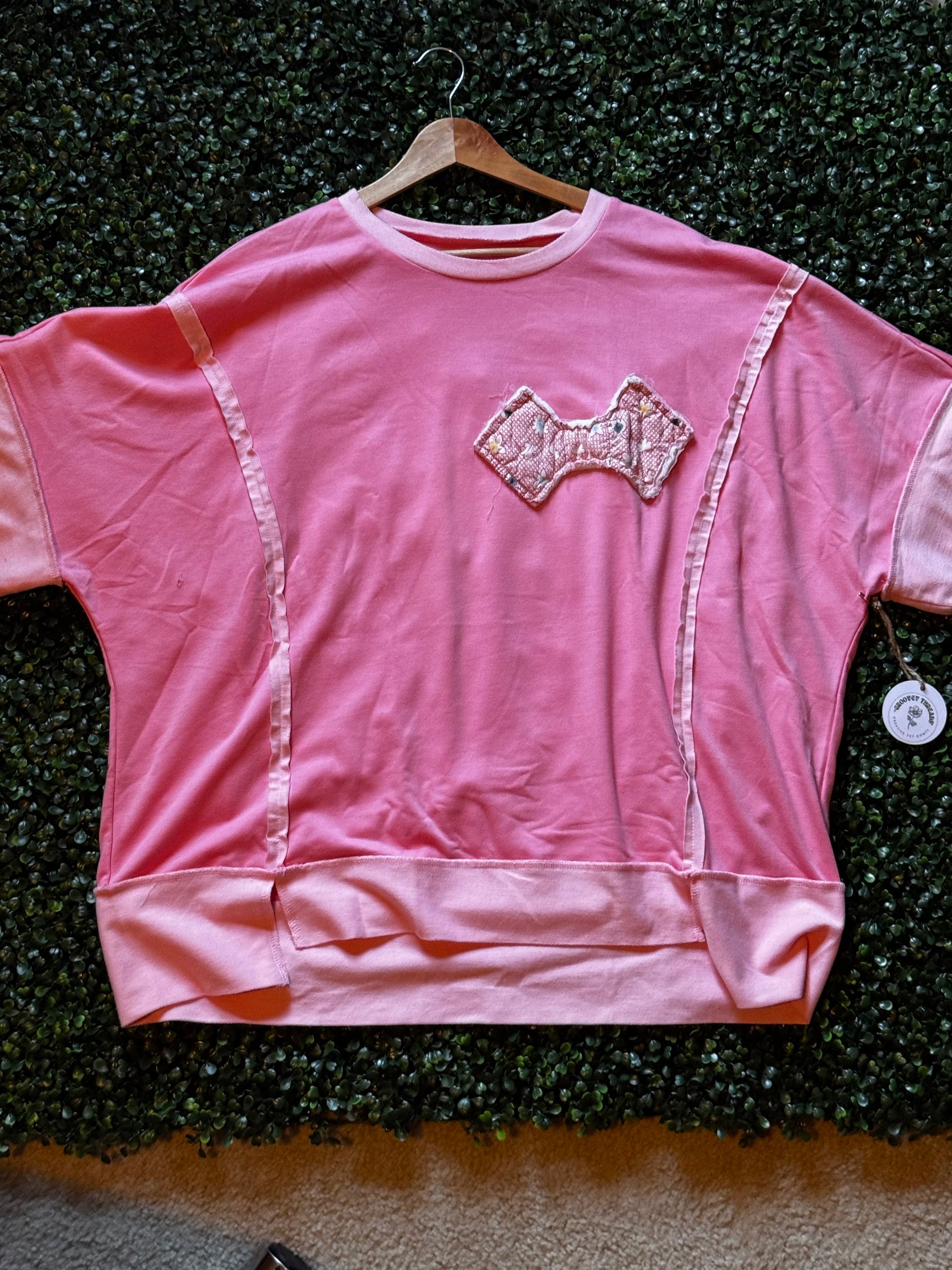 Pink Blossom Half Sleeve Raw Seam High Low Side Split Top with a vintage quilted bow stitched on the left side.