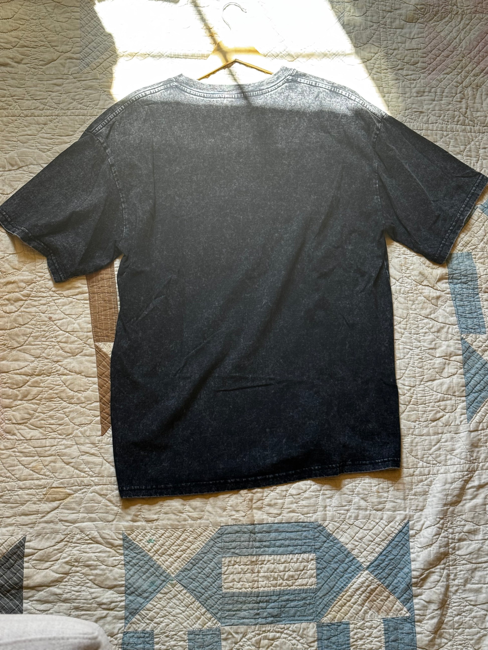 00’s Black acid wash t-shirt with a vintage quilt year design stitched in the front.