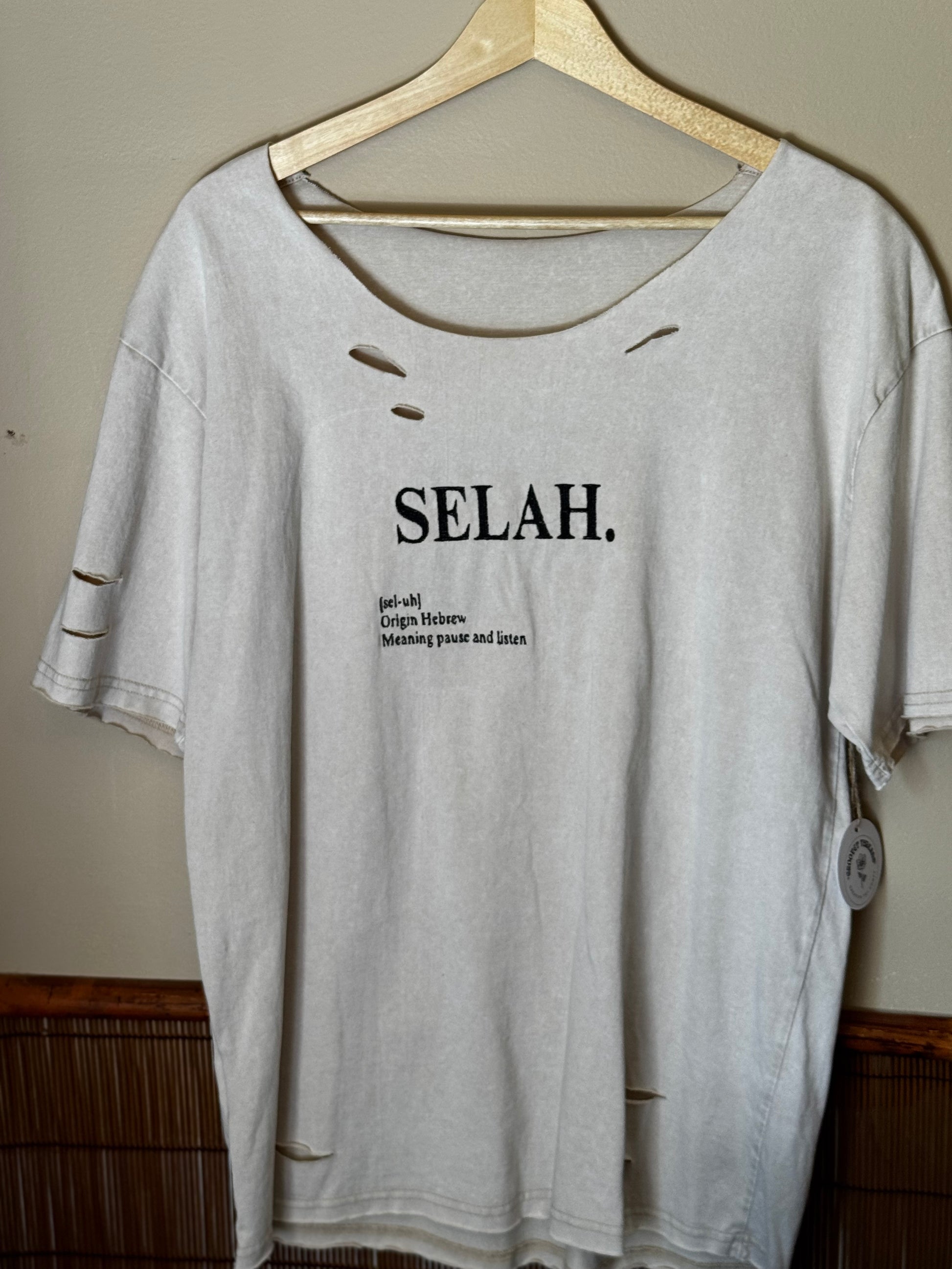 Cream acid wash distressed t-shirt with Selah embroidery, inspired by Psalm 57:1-11 — a cozy reminder to pause and rest in His presence.