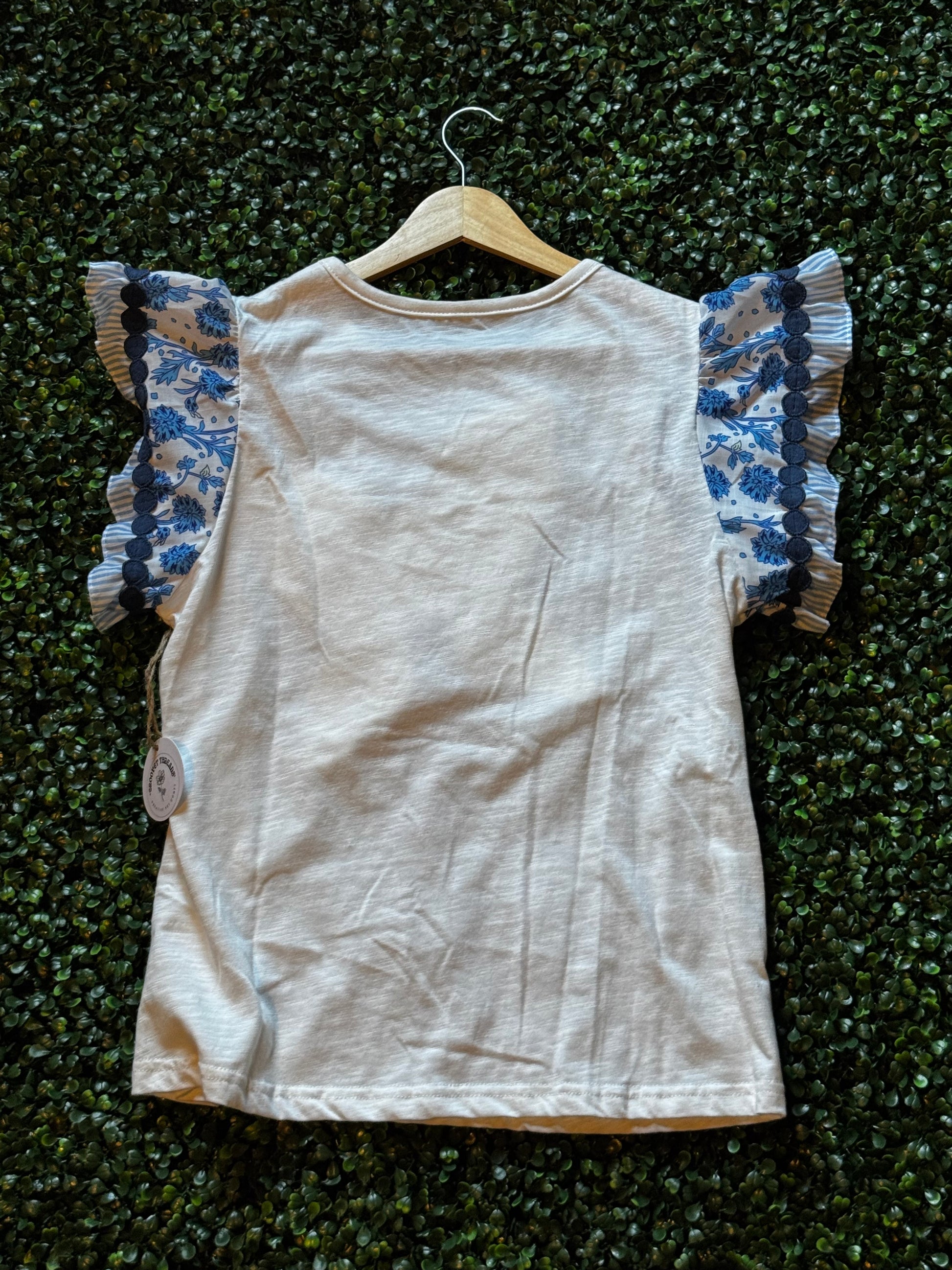 Sky blue Trim Printed Flutter Sleeve Contrast Patchwork Blouse with a quilted butterfly stitched to the front.